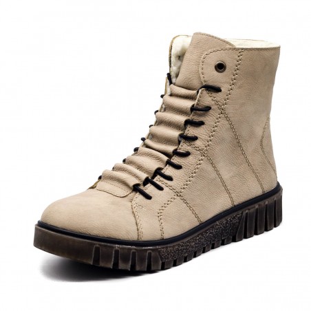 Moteriški smėlio spalvos aulinukai suvarstomais guminiais raišteliais.