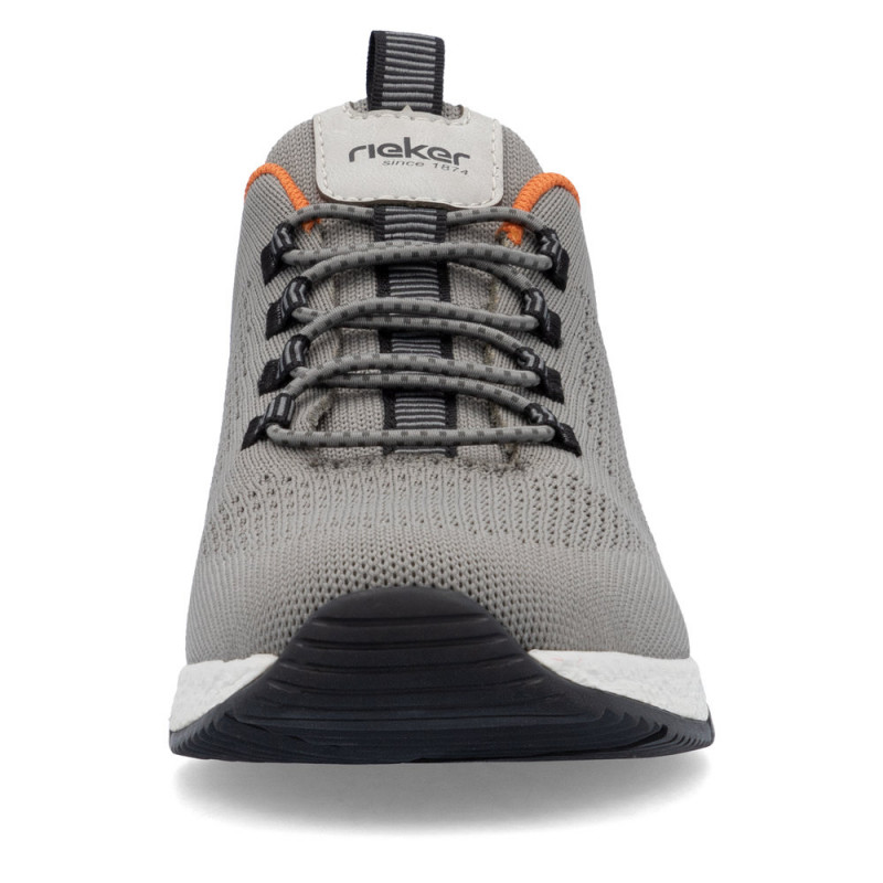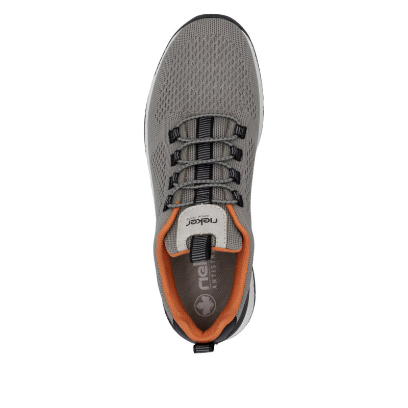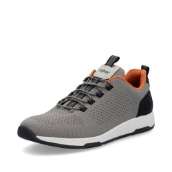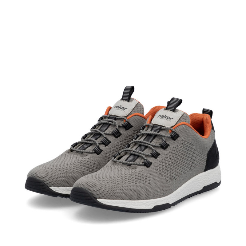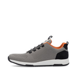 Pilkos spalvos, tekstiliniai vyriški sportiniai bateliai.